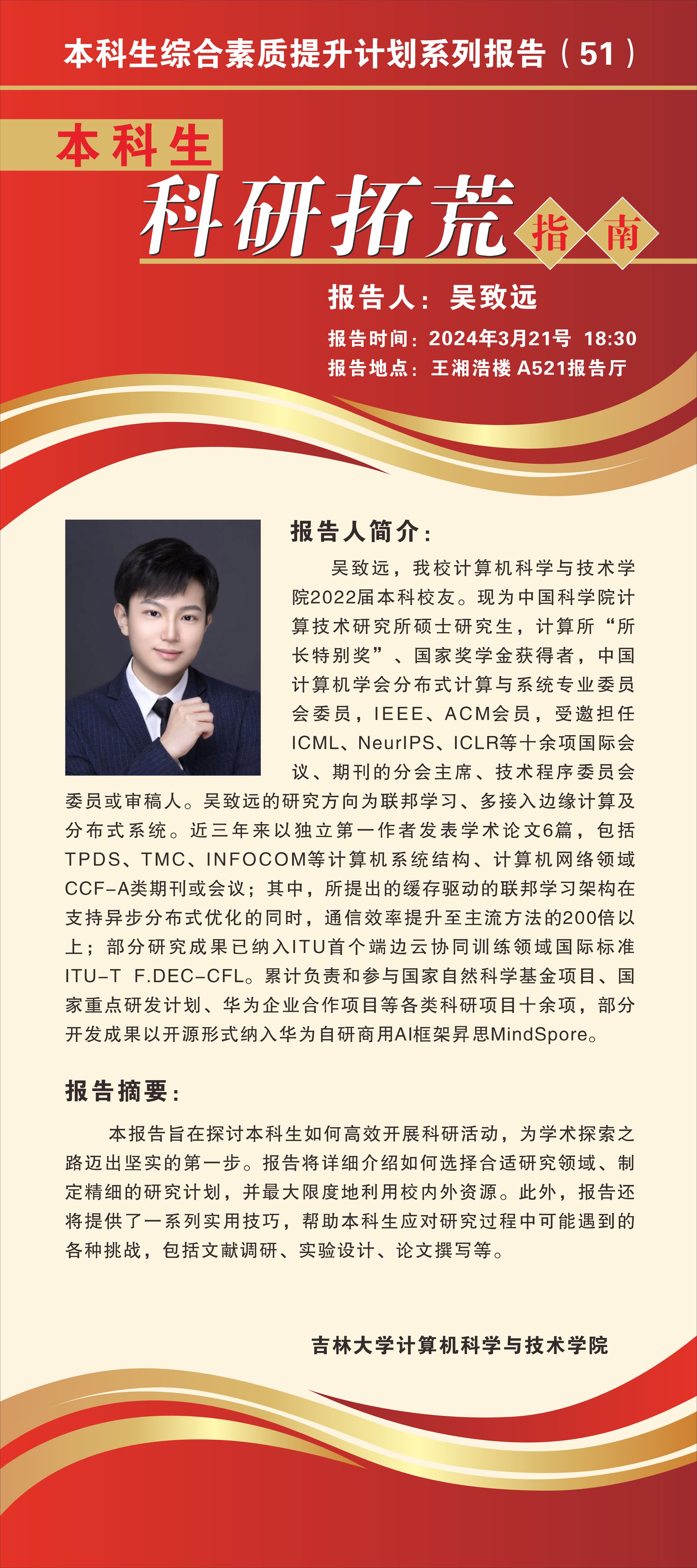 报告人简介:吴致远,我校SJB世俱杯官方网站2022届本科校友。现为中国科学院计算技术研究所硕士研究生,计算所“所长特别奖”、国家奖学金获得者,中国计算机学会分布式计算与系统专业委员会委员,IEEE、ACM会员,受邀担任ICML、NeurIPS、ICLR等十余项国际会议、期刊的分会主席、技术程序委员会委员或审稿人。吴致远的研究方向为联邦学习、多接入边缘计算及分布式系统。近三年来以独立第一作者发表学术论文6篇,包括TPDS、TMC、INFOCOM等计算机系统结构、计算机网络领域CCF-A类期刊或会议;其中,所提出的缓存驱动的联邦学习架构在支持异步分布式优化的同时,通信效率提升至主流方法的200倍以上;部分研究成果已纳入ITU首个端边云协同训练领域国际标准ITU-T F.DEC-CFL。累计负责和参与国家自然科学基金项目、国家重点研发计划、华为企业合作项目等各类科研项目十余项,部分开发成果以开源形式纳入华为自研商用AI框架昇思MindSpore。
