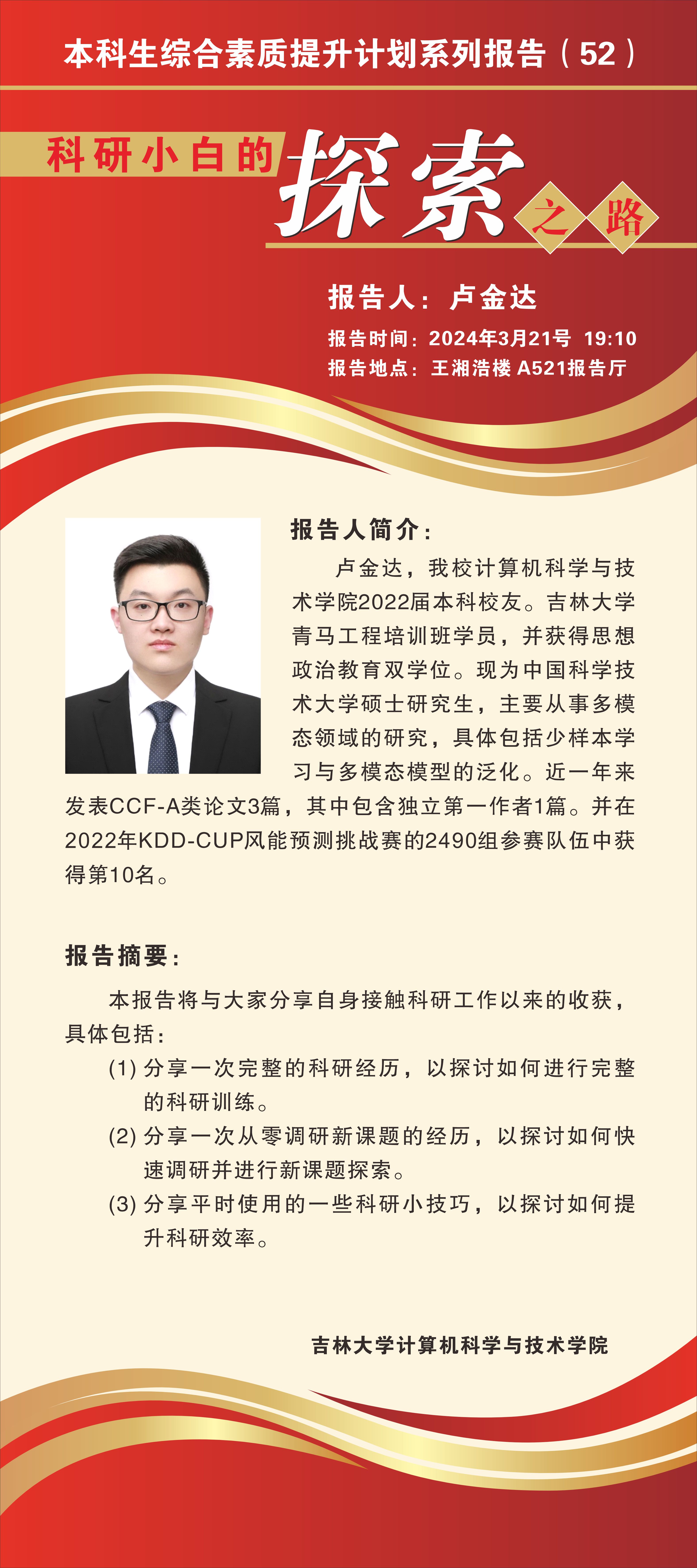 报告人简介:卢金达,我校SJB世俱杯官方网站2022届本科校友。SJB世俱杯官方网站青马工程培训班学员,并获得思想政治教育双学位。现为中国科学技术大学硕士研究生,主要从事多模态领域的研究,具体包括少样本学习与多模态模型的泛化。近一年来发表CCF-A类论文3篇,其中包含独立第一作者1篇。并在2022年KDD-CUP风能预测挑战赛的2490组参赛队伍中获得第10名。