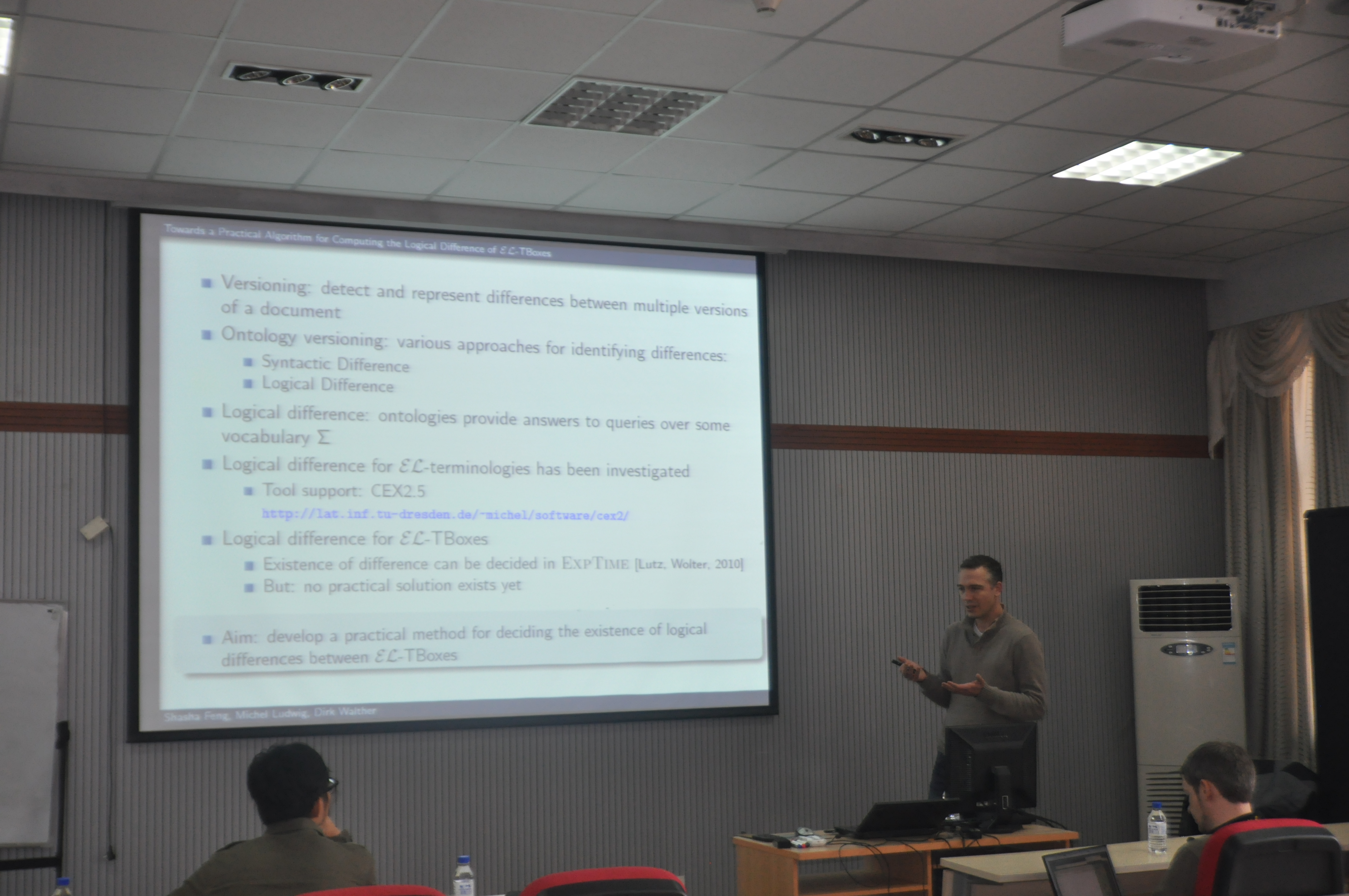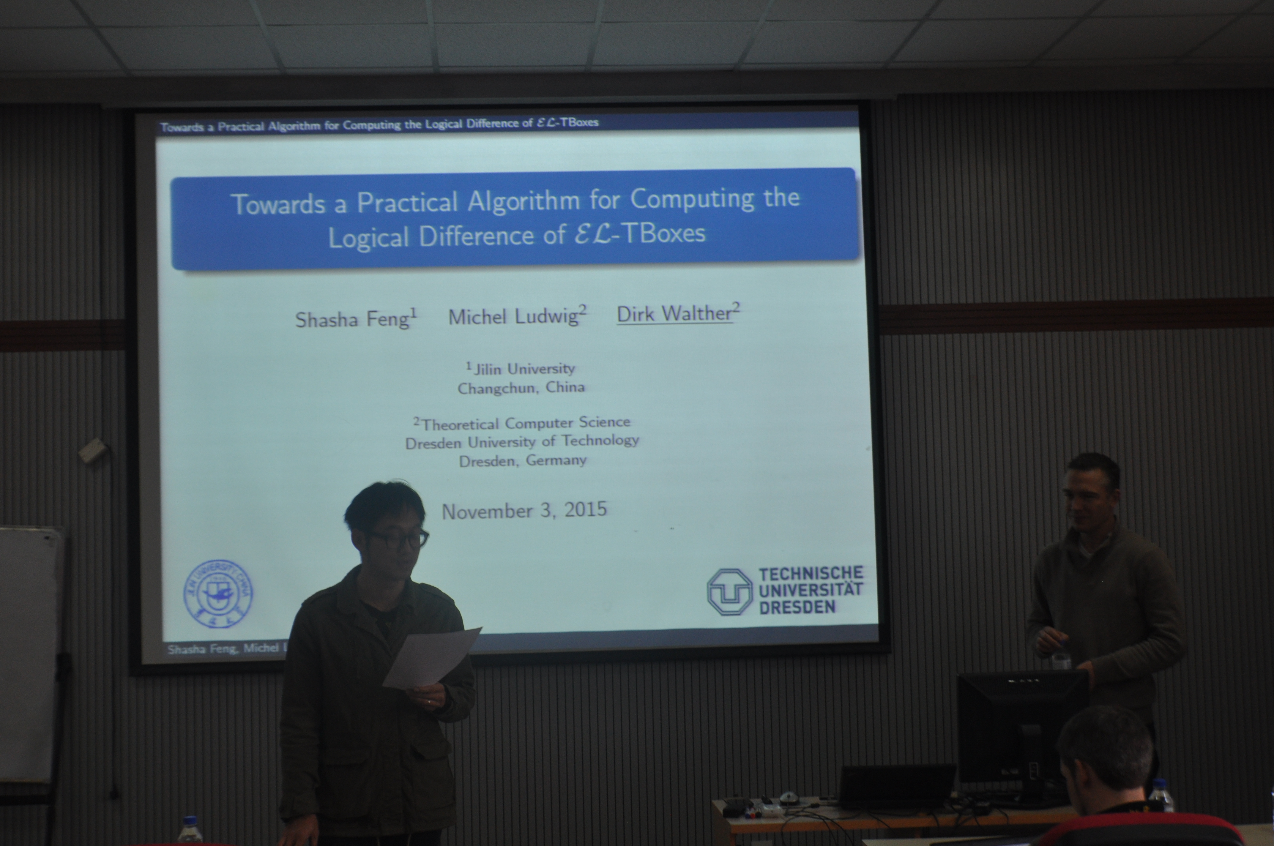 近日,德国德累斯顿工业大学Dirk Walther博士应SJB世俱杯官方网站张睿老师邀请来我校进行为期两周的学术交流活动。此次学术访问由SJB世俱杯官方网站国际处的青年骨干教师引智培育计划项目资助。 2015年11月3日上午,Dirk Walther博士做题为“寻找计算EL-TBoxes逻辑差的实用算法”的学术报告。