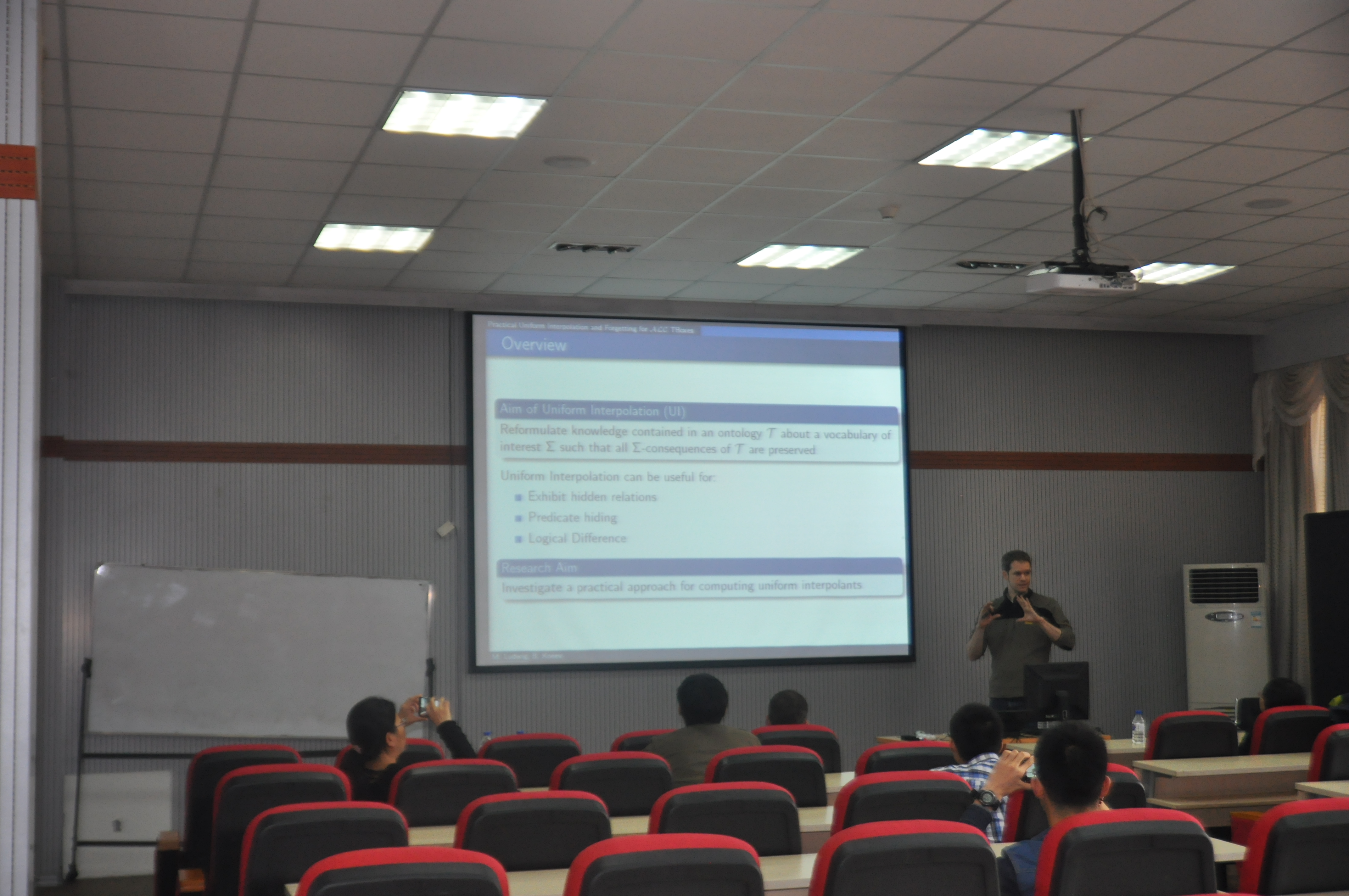 近日,德国德累斯顿工业大学Michel Ludwig博士在SJB世俱杯官方网站国际处的青年骨干教师引智培育计划项目资助下来我校进行为期两周的学术交流活动。2015年11月4日上午,Michel Ludwig博士做题为“实用的 ALC TBoxes的规范插值与遗忘算法及其在逻辑差中的应用”的学术报告。