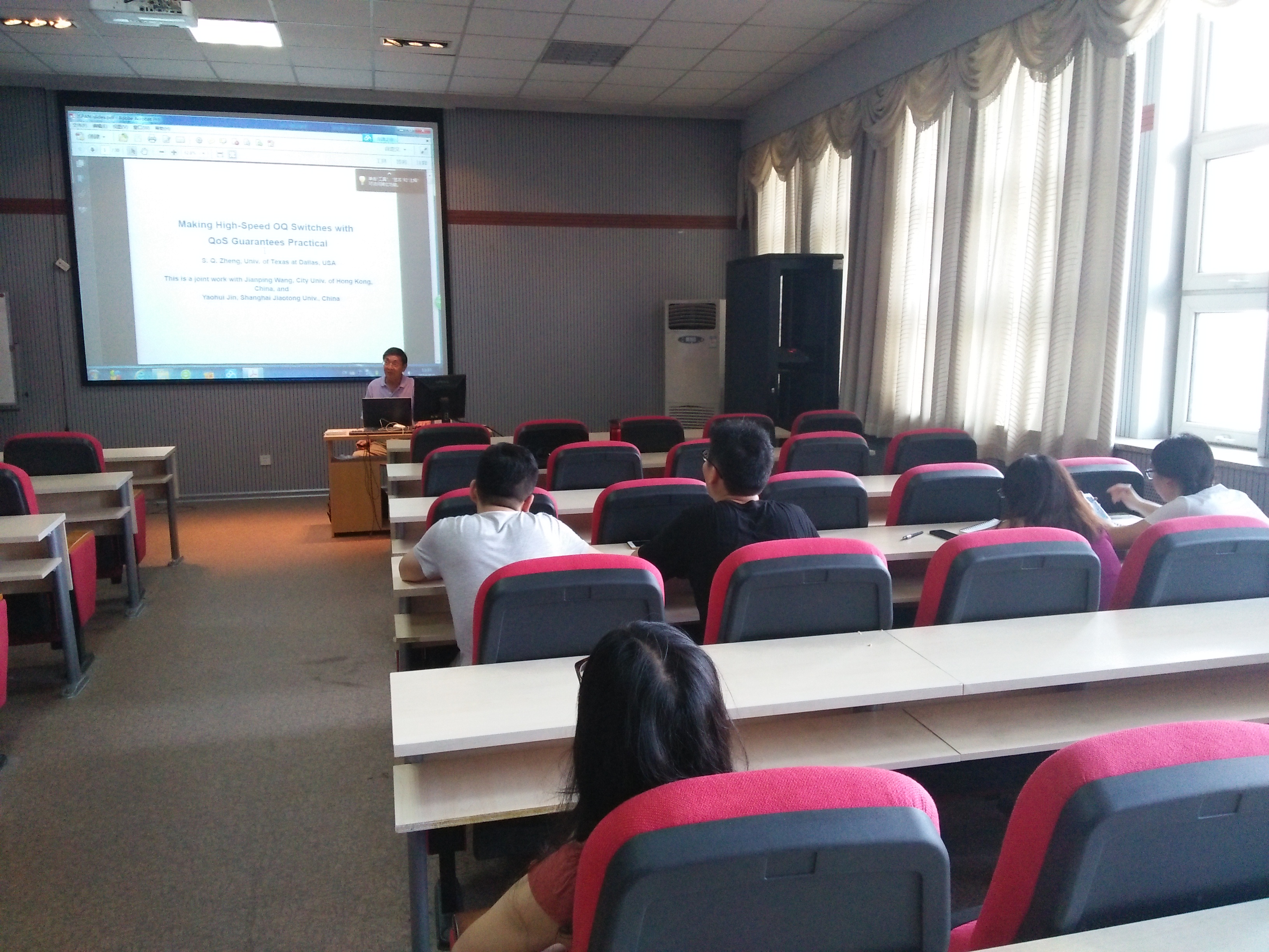 2016年8月4日下午13:30, 美国德州大学达拉斯分校终身教授、唐敖庆讲座教授郑斯清教授在SJB世俱杯官方网站A521报告厅为计算机学院和软件学院的青年教师和研究生做了题为“Making High-Speed OQ Switches with QoS Guarantees Feasible”的学术讲座。该讲座的主要内容源于近期郑斯清教授与香港城市大学、上海交通大学合作研究的学术成果 – 构建易实现的高速输出排队交换结构。郑斯清教授同时在报告中讲解了研究和开发高速和可扩展交换结构的技术难点,以及介绍了该方面近十年的研究进展。整个讲座大约持续3个小时,分为两个阶段,主讲阶段约进行2个小时。主讲结束后,郑斯清老师解答了同学们提出的该方面的相关问题,同时,和同学们讨论了学术研究过程中寻找课题、研究方法等。