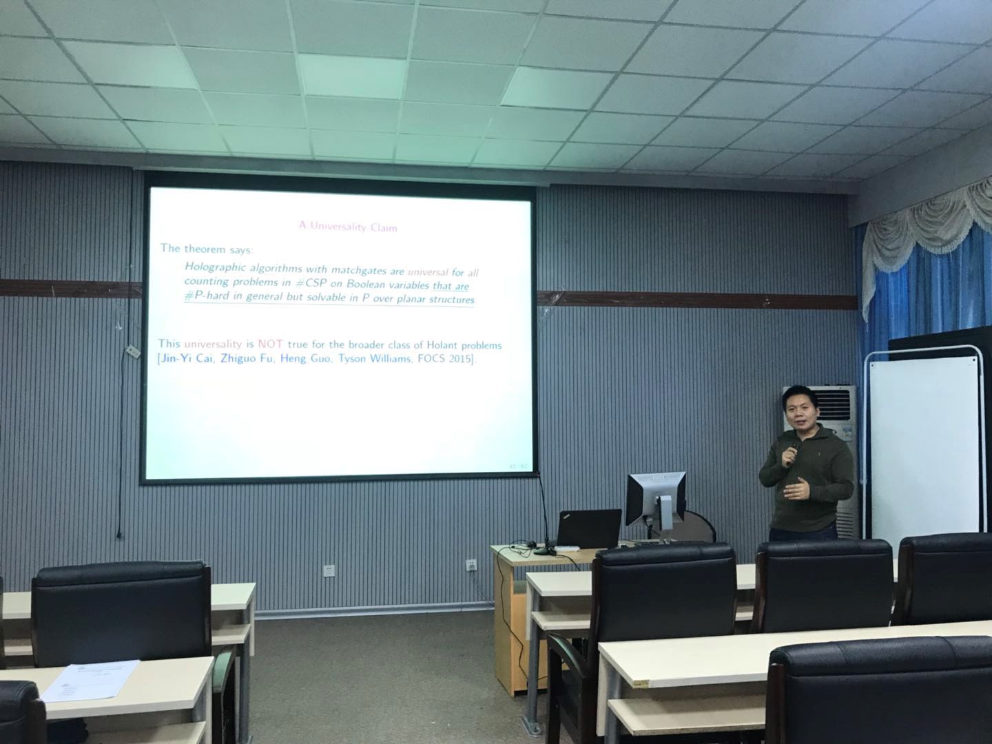 2017年12月13日上午,付治国博士在SJB世俱杯官方网站计算机学院做了题为“Holographic Algorithm with Matchgates Is Universal for Planar #CSP Over Boolean Domain”的学术报告。付治国博士于2009年在SJB世俱杯官方网站获计算数学博士学位,现为东北师范大学信息科学与技术学院副教授,2014年-2017年在美国威斯康星大学麦迪逊分校从事计算复杂性研究。主要研究方向为计数问题的计算复杂性、包括计数问题的计算复杂性分类、全息算法以及计数问题的近似算法和随机算法,已在STOC, FOCS, SIAM. J. Computing, J. Information and Computation等著名会议和期刊发表多篇论文。