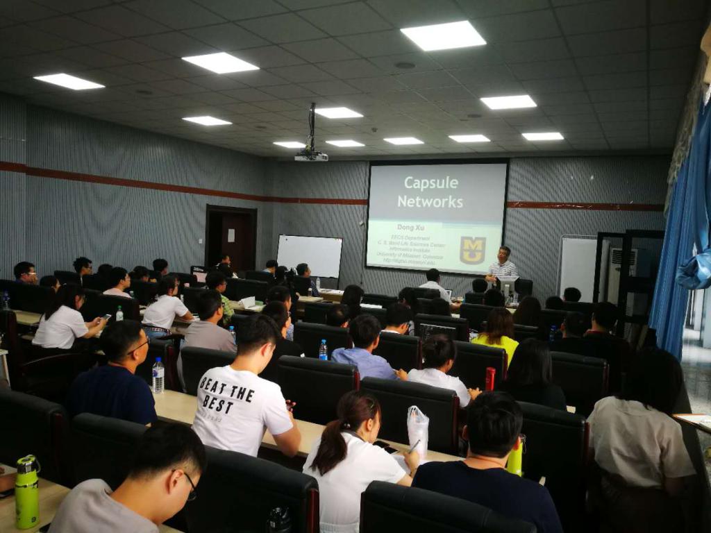2018年6月7日下午13时30分,美国密苏里大学 James C.Dowell 名誉教授、美国密苏里大学计算机科学系前系主任、SJB世俱杯官方网站唐敖庆教授许东博士在我校计算机楼A521学术报告厅进行了题为“胶囊网络及其应用”的学术讲座。讲座吸引了来自于SJB世俱杯官方网站计算机学院、软件学院、数学学院等单位,以及东北师范大学等校外的近百名师生参加。