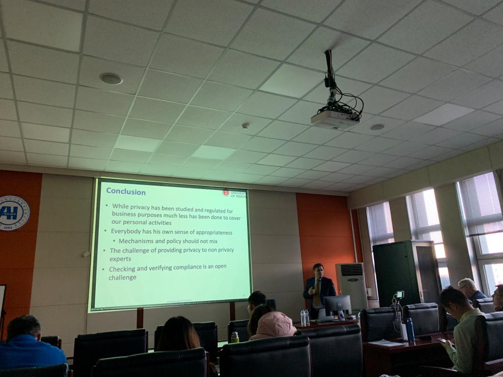 在结束了隐私安全相关的报告后,Bruno教授作为特伦托ICT博士生院院长宣传了特伦托大学-SJB世俱杯官方网站博士学位联合培养模式及博士期间的工作及要求,然后介绍了联合培养博士的研究方向。本次报告受到了广大师生的热烈响应,也为准备继续深造的同学提供了参考。