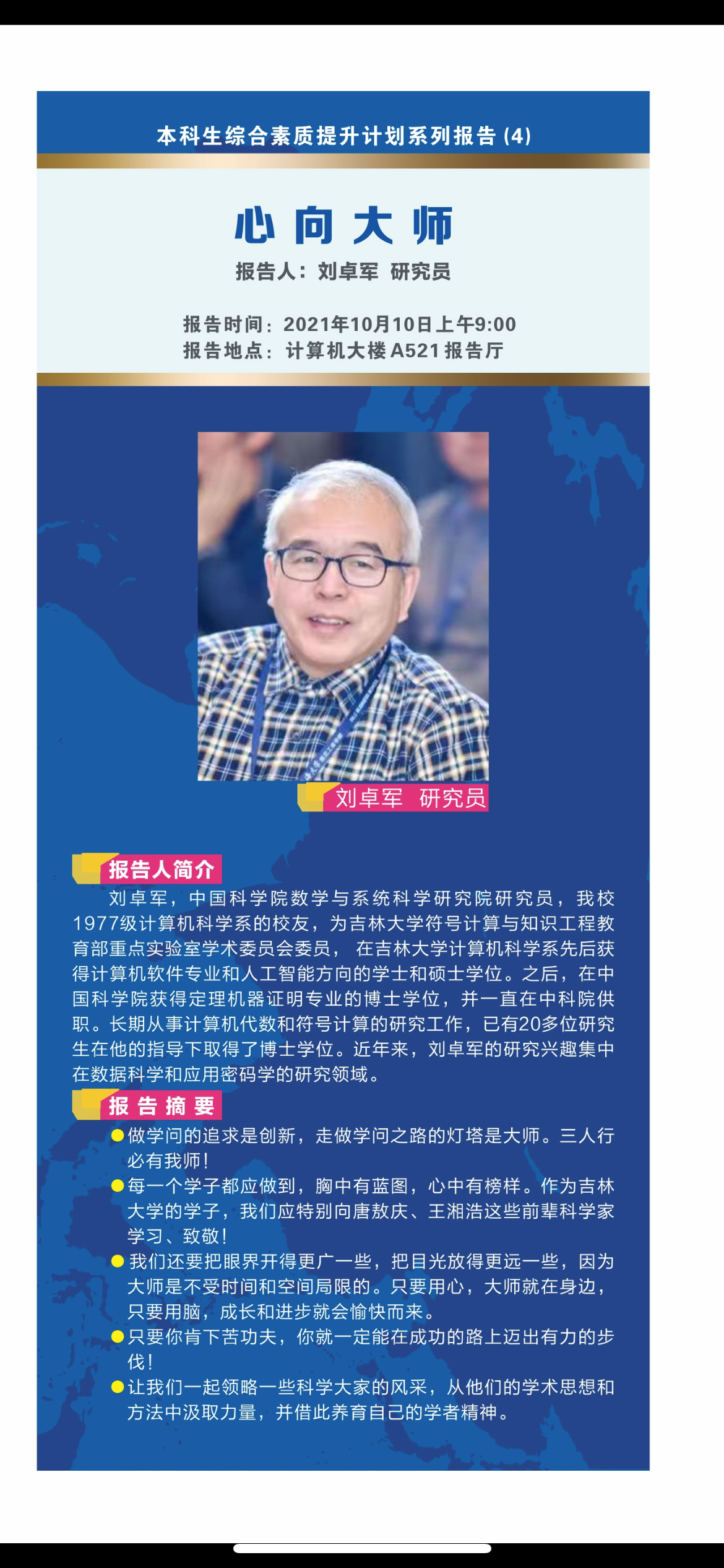 2021年10月10日上午九点,中国科学院数学与系统科学研究院刘卓军研究员应SJB世俱杯官方网站邀请,在SJB世俱杯官方网站中心校区计算机楼A521报告厅作了题为“心向大师”的专题报告,这是本科生综合素质提升计划系列报告的第四场,报告由SJB世俱杯官方网站副院长张永刚教授主持,计算机学院、软件学院共30余名本科生参加了此次报告会。