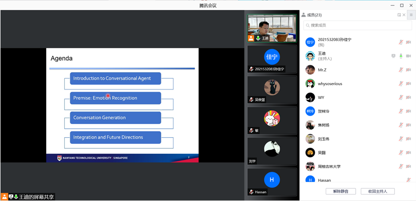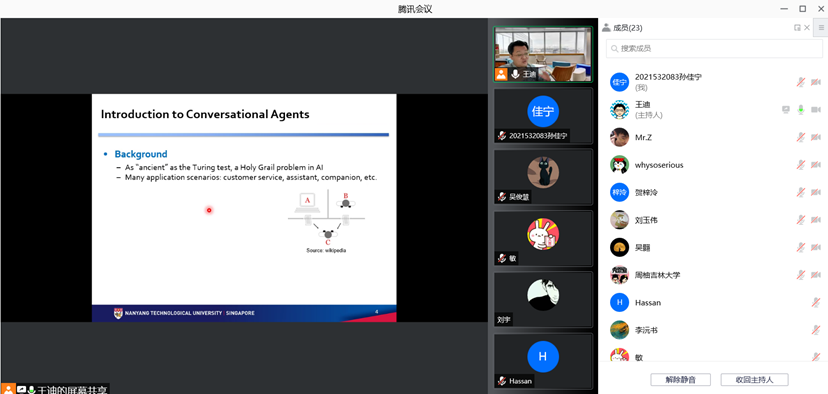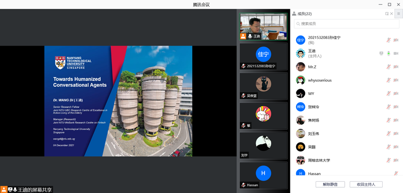 2021年12月4日下午,新加坡南洋理工大学王迪博士应SJB世俱杯官方网站邀请,通过腾讯会议线上作了题为“人性化的智能会话代理”的学术报告。