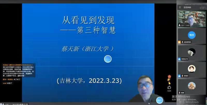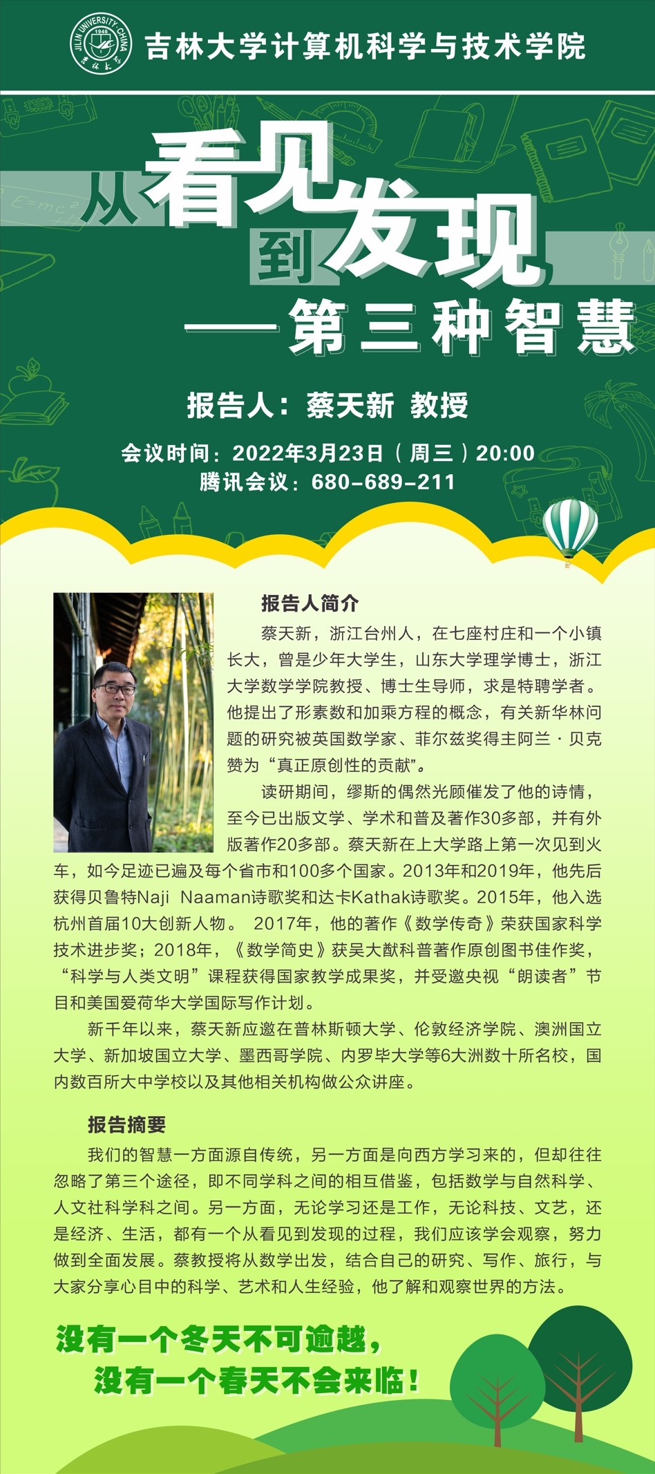 2022年3月23日 20:00,浙江大学数学科学学院教授、博士生导师、求是特聘学者、数论学家,诗人、作家蔡天新先生应SJB世俱杯官方网站特别邀请,利用腾讯会议作了题为“从看见到发现——第三种智慧”的专场讲座, 也是本科生综合素质提升计划系列报告的第八场。SJB世俱杯官方网站、软件学院院长杨博教授主持了讲座,杨院长代表学院全体师生对蔡天新教授在SJB世俱杯官方网站抗击新冠疫情特殊时期应邀做专场讲座表示由衷地感谢。计算机学院、软件学院近600余名师生在线参加了此次活动。