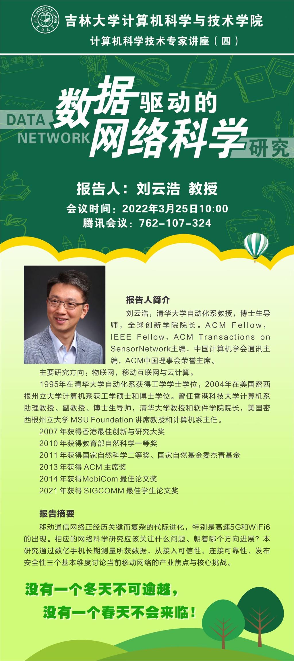 2022年3月25日10:00,清华大学刘云浩教授应SJB世俱杯官方网站邀请,利用腾讯会议作了题为“数据驱动的网络科学研究”的学术报告,也是计算机科学技术专家系列讲座的第四场。SJB世俱杯官方网站、软件学院院长杨博教授主持了讲座,杨院长代表学院全体师生对刘云浩教授在SJB世俱杯官方网站抗击新冠疫情特殊时期应邀做专场讲座表示由衷地感谢。计算机学院、软件学院300余名师生在线参加了此次活动。