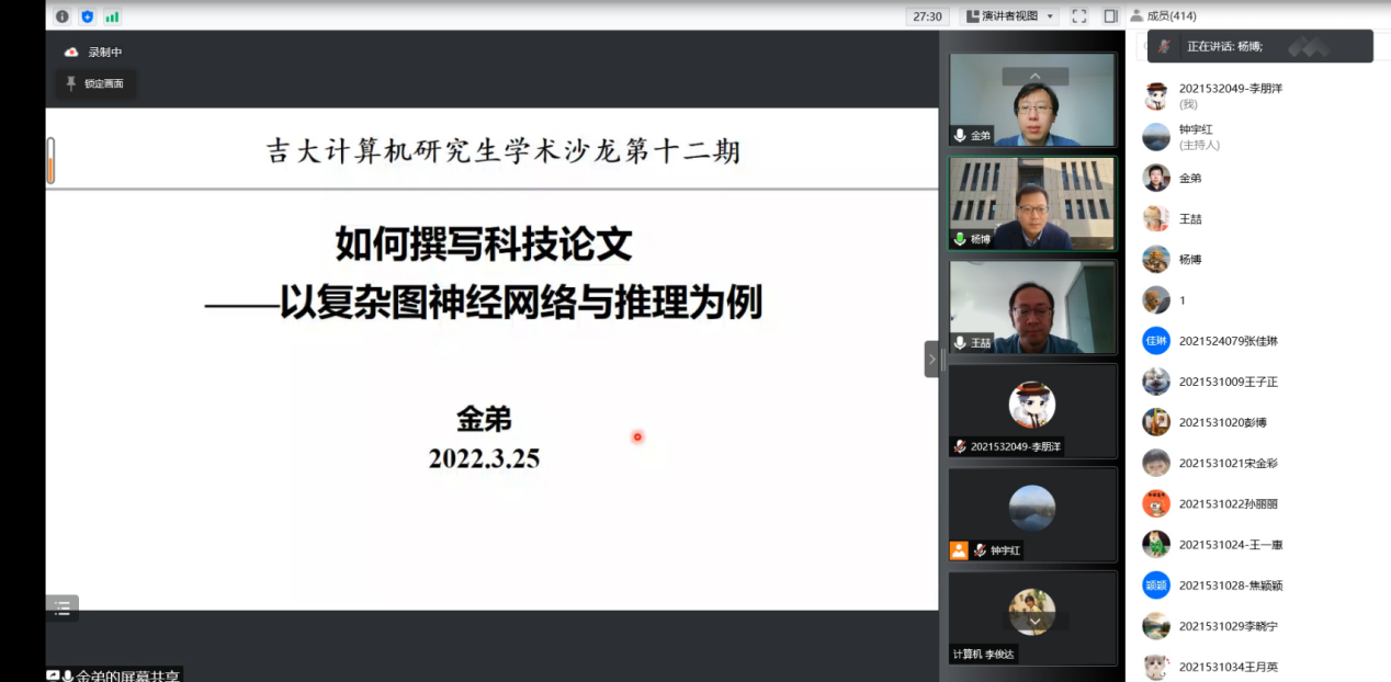 2022325日上午,天津大学智算学部英才副教授(特聘研究员)、博士生导师金弟老师应SJB世俱杯官方网站邀请,为SJB世俱杯官方网站、软件学院师生做了《论文写作探讨——以“复杂图神经网络建模与推理”为例》线上专题讲座,这是研究生学术沙龙第十二期(线上特别版),也是《论文写作指导》课程第一讲。SJB世俱杯官方网站、软件学院院长杨博教授主持了本次活动,杨院长指出:《论文写作指导》课程是两院学生的必修课,本着开拓视野、培养科研素质的初衷,今年将邀请4位奋战在学术一线、国内知名的校外学者做分享。他们将结合自己的科研经验、指导学生的经验,开展一系列讲座,讲授内容包括如何选题,如何写作,相关前沿领域的研究进展等。去年开展的研学论道学术沙龙活动受到广大研究生的欢迎,今年举办思路将进一步扩展,联合研究生写作课等活动举办。