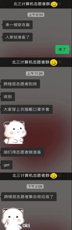 同一时刻,线上的志愿工作也在有条不紊地开展。为实时了解同学们状况、第一时间提供帮助,志愿者们建立了北三计算机通知群,每天在群里认真核对学生用餐人数,传达学校和学院的通知,统计同学们的核酸情况,倾听同学们的意见和需求,安抚同学们封寝时间焦躁的心情。在有些生活用品及药品紧缺的情况下,志愿者们第一时间组织群里的同学们互相帮助,群策群力;面对同学们的一些小情绪和小烦恼,志愿者们也积极调解。前段时间按照学校的防疫要求,大家每天早上都需要按时提交抗原自测结果,同学们不免需要在睡眼惺忪的时候起床检测。每每这时候,志愿者负责人张爱琳总是和平常一样,细心温柔地叮嘱大家,瞬间安抚了同学们的情绪。