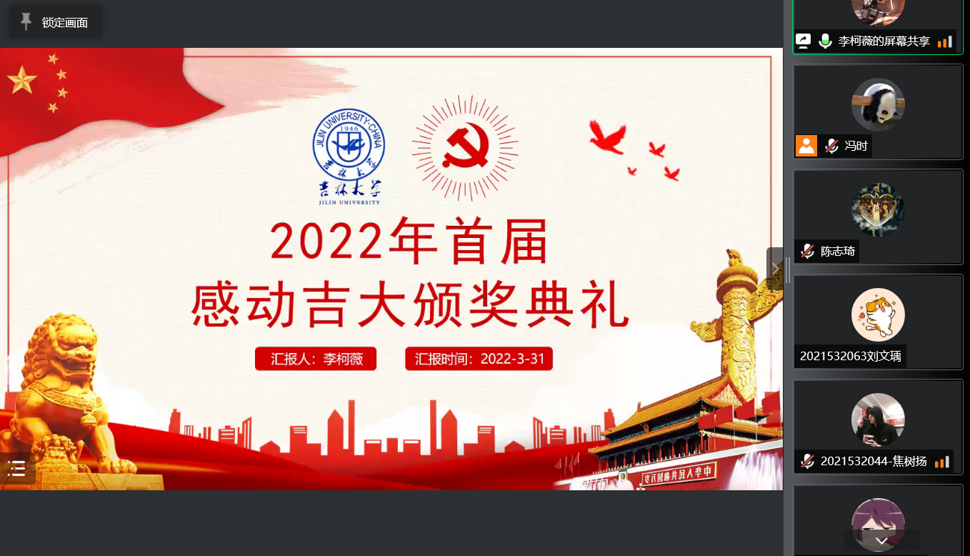支部设置了正能量满满多媒体奖,争为人先为校牺牲奖,大锅饭最佳厨师奖,团结友爱最美吉大人奖等多个奖项。在每个奖项的提名环节中,同学们都乐于分享,疫情能够防控住,自然少不了同学们的大力支持。每日为大家进行核酸检测的大白,一直坚守在一线的老师们,我们的志愿者们,还有给吉大捐助的校友企业们。今天是封寝的第18天,同学们谨记防疫要求做到了非必要不出寝,也为抗击疫情做出自己的贡献。