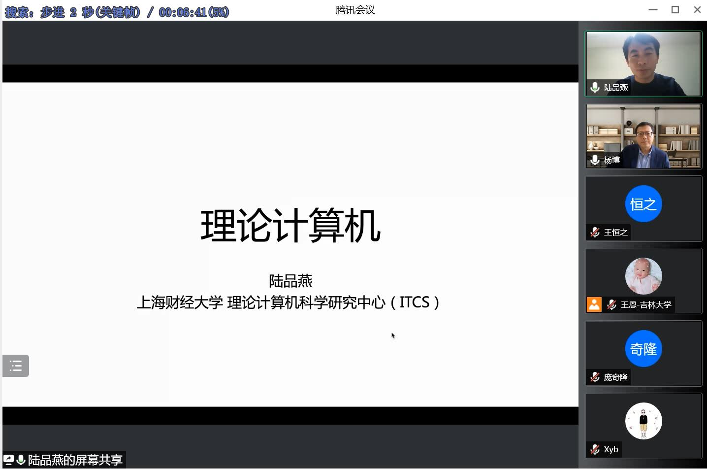 2022年4月16日13:30,上海财经大学陆品燕教授应SJB世俱杯官方网站邀请,利用腾讯会议作了题为“理论计算机”的学术报告。SJB世俱杯官方网站、软件学院院长杨博教授主持了讲座,并代表学院全体师生对陆品燕教授在SJB世俱杯官方网站抗击新冠疫情特殊时期应邀做专场讲座表示由衷地感谢。