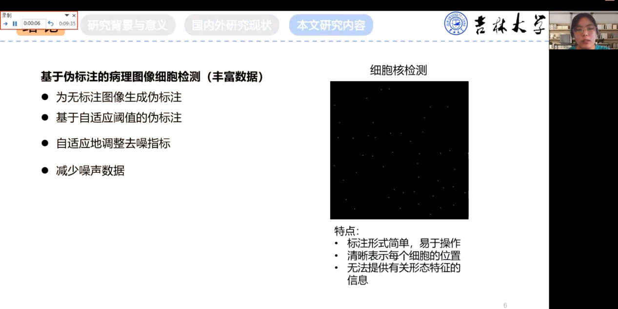 会议的下半场,由讲者张振亭对“病理图像分析”进行学术分享。讲者首先介绍了在现有细胞检测任务中存在的边框检测、细胞核检测和细胞分割中存在的各类问题,从而提出了在丰富数据下基于伪标注的病理图像细胞检测方案。论文在数据预处理中采用了扩展标注来缓解细胞重叠等问题,之后提出了基于自适应阈值的伪标注方案(PLAT),这种方案具有表达整体特性、根据认知不确定性具有自适应阈值等优点,最后通过再训练过程多次生成伪标注来丰富学习样本并进行迭代来优化模型。讲者的模型通过实验比对,发现结果总是优于其他半监督方法和全局阈值方案,体现了算法的有效性。