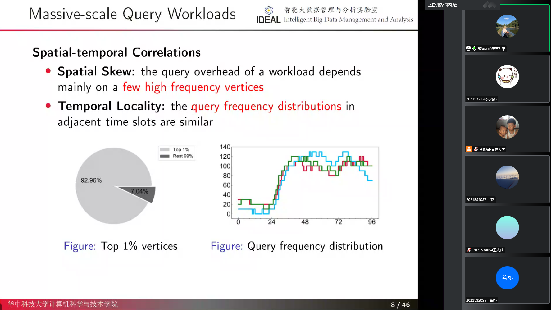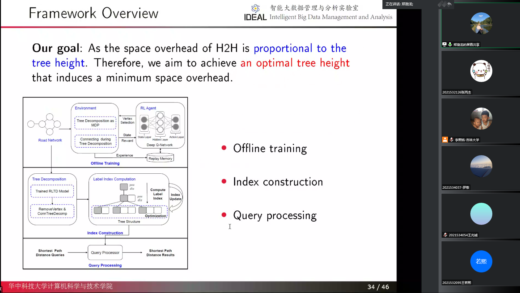 在讲座中,郑渤龙老师以最短路径计算在导航系统、叫车服务、外卖应用程序和快递方面的应用入手,深入浅出地引入了道路网络中高效数据驱动的最短路径距离查询的两项研究:工作负载感知的最短距离查询和基于强化学习的树分解距离查询。并详细介绍了与上述两项研究有关的知识点和其在应用过程中面临的核心问题。随后,郑渤龙老师详细介绍了所在团队围绕为了获得一个最佳的树高,从而产生最小的空间开销而开展的工作。