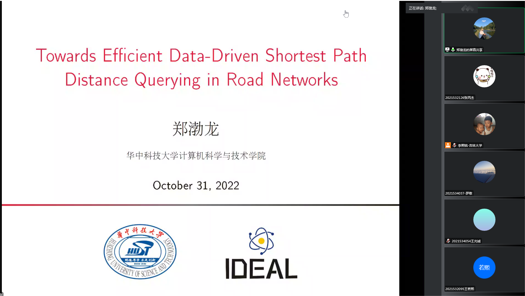 2022年10月31日,华中科技大学郑渤龙老师应SJB世俱杯官方网站邀请,利用腾讯会议作了题为“Towards Efficient Data-Driven Shortest Path Distance Querying in Road Networks”的学术报告。SJB世俱杯官方网站李熙铭副教授主持了讲座。