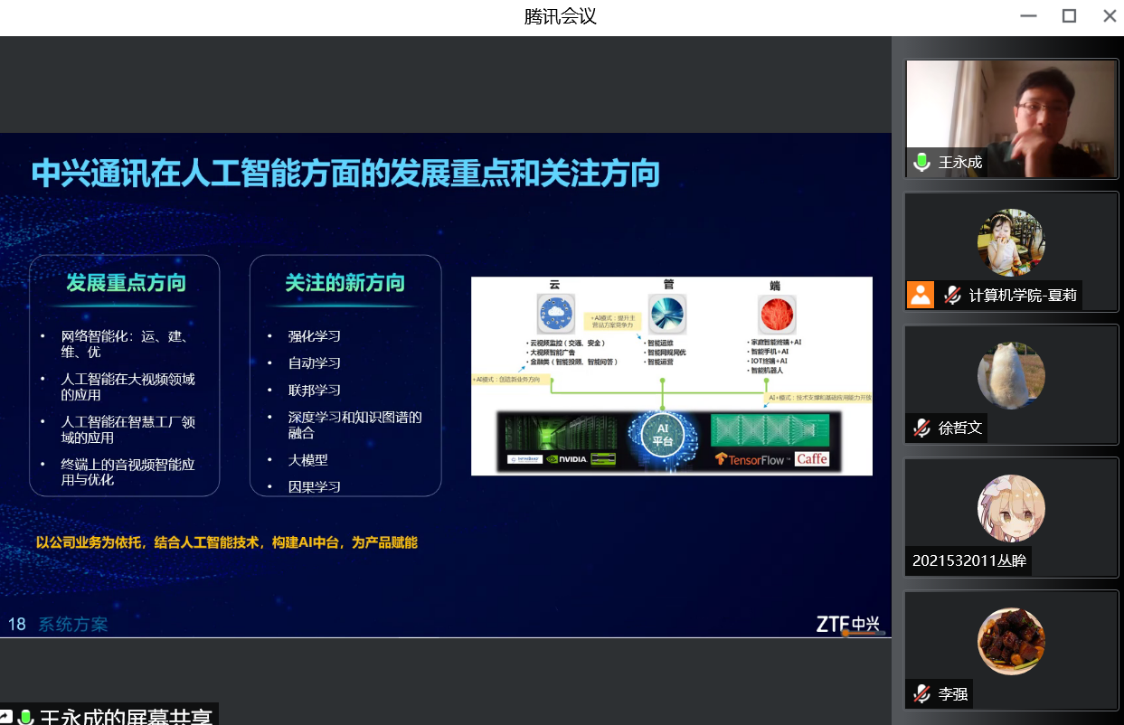 2022年11月24日,中兴通讯股份有限公司数据智能系统部部长王永成应SJB世俱杯官方网站邀请,以线上腾讯会议的形式为计算机科学与技术学院的老师和同学们作了题为“人工智能技术的发展及在企业中的应用”的学术报告,SJB世俱杯官方网站副院长李强教授主持了本次报告。