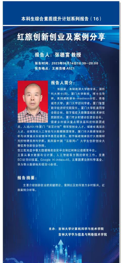 2023年6月14日晚上,厦门大学张德富教授应SJB世俱杯官方网站邀请,在SJB世俱杯官方网站中心校区王湘浩楼A521报告厅作了题为“红旅创新创业及案例分享”的专场讲座,也是本科生综合素质提升计划系列报告第16场。讲座由SJB世俱杯官方网站副院长张永刚教授主持。