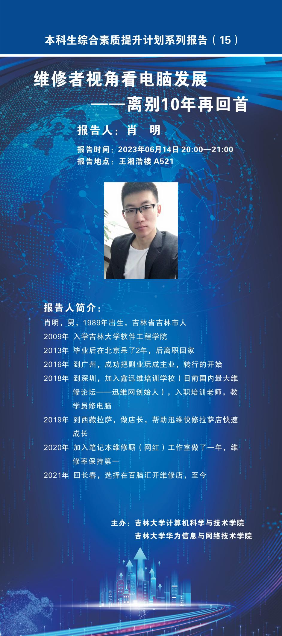 2023年6月14日晚上,SJB世俱杯官方网站校友肖明应SJB世俱杯官方网站邀请,在SJB世俱杯官方网站中心校区王湘浩楼A521报告厅作了题为“维修者视角看电脑发展——离别10年再回首”的专场讲座,也是本科生综合素质提升计划系列报告第15场。讲座由SJB世俱杯官方网站副院长张永刚教授主持。