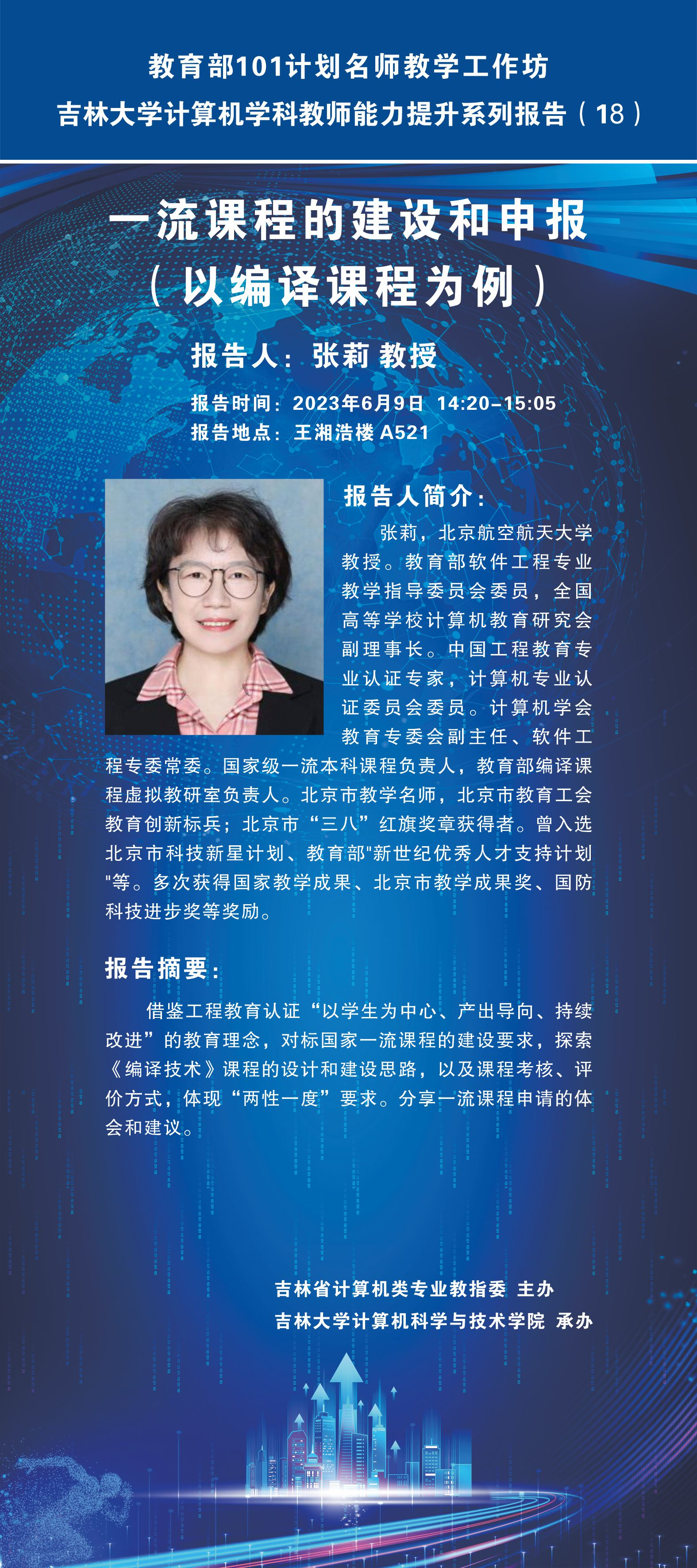 第二场报告是张莉教授带来的名为《一流课程的建设和申报(以编译课程为例)》的报告,借鉴工程教育认证“以学生为中心、产出导向、持续改进”的教育理念,对标国家一流课程的建设要求,探索《编译技术》课程的设计和建设思路,以及课程考核、评价方式,体现“两性一度”要求。分享一流课程申请的体会和建议。