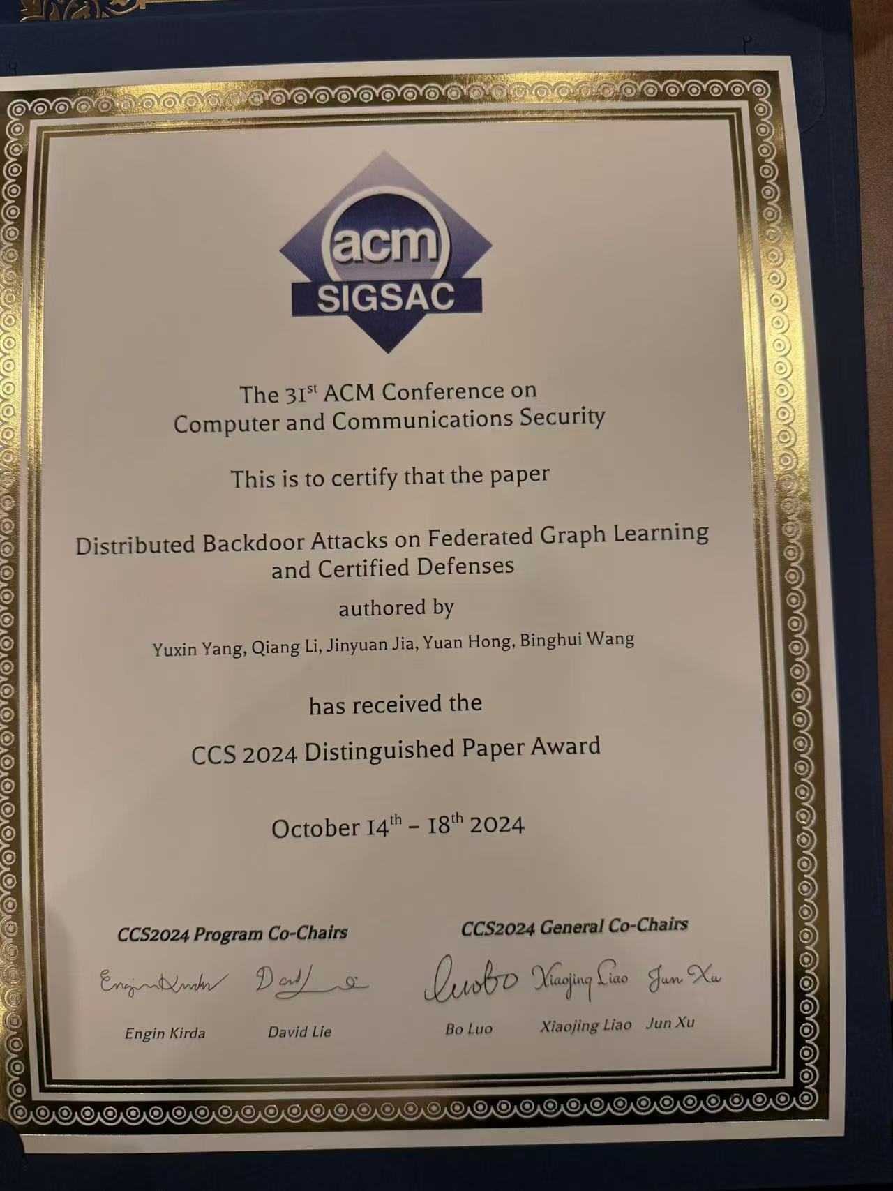 SJB世俱杯官方网站2022级博士生杨雨欣获得ACM CCS 2024(ACM Conference on Computer and Communications Security)最佳论文奖。ACM CCS是国际上网络与信息安全的四大顶会之一,是CCF推荐A类会议。