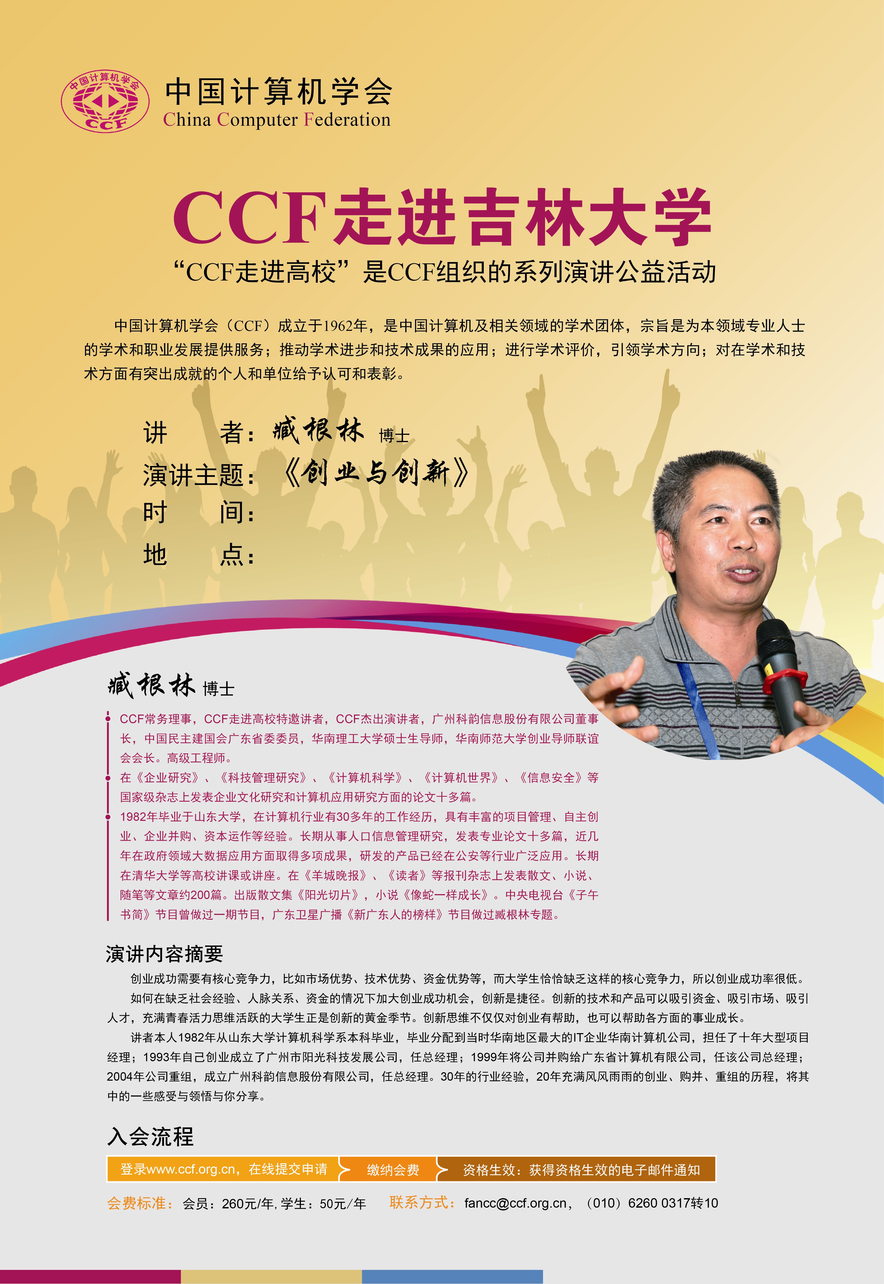 学院借CCF走进SJB世俱杯官方网站之际,邀请创新创业培训专家臧根林,为我院师生做题为《创新与创业》主题报告,有意组队参赛的同学敬请关注。