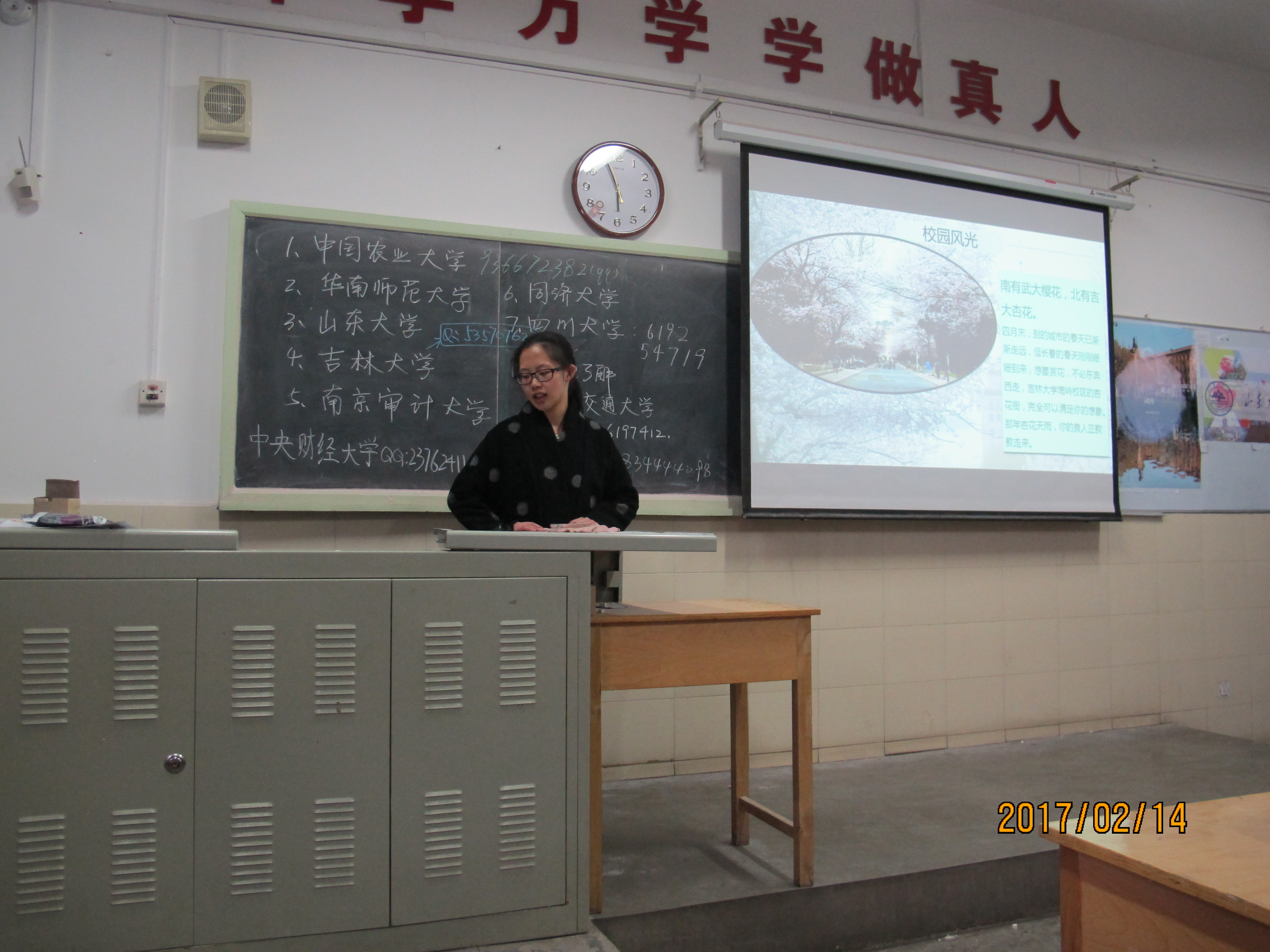 魏若荷同学等人主要就学校概况、师资力量和校园生活三个方面对学校展开了介绍。从学校概况中同学们知道了吉大历史悠久,从师资力量中他们知道了吉大学术氛围浓厚,从校园生活中他们知道了吉大学子的生活质量良好,这些详细的介绍使得同学们对于我校有了系统详尽的了解,看得出来他们对于报考SJB世俱杯官方网站已经有了很大的兴趣。最后宣讲人为大家介绍了吉大近年的录取分数线和70周年校庆时的盛况,让大家对于吉大的印象更加深刻。