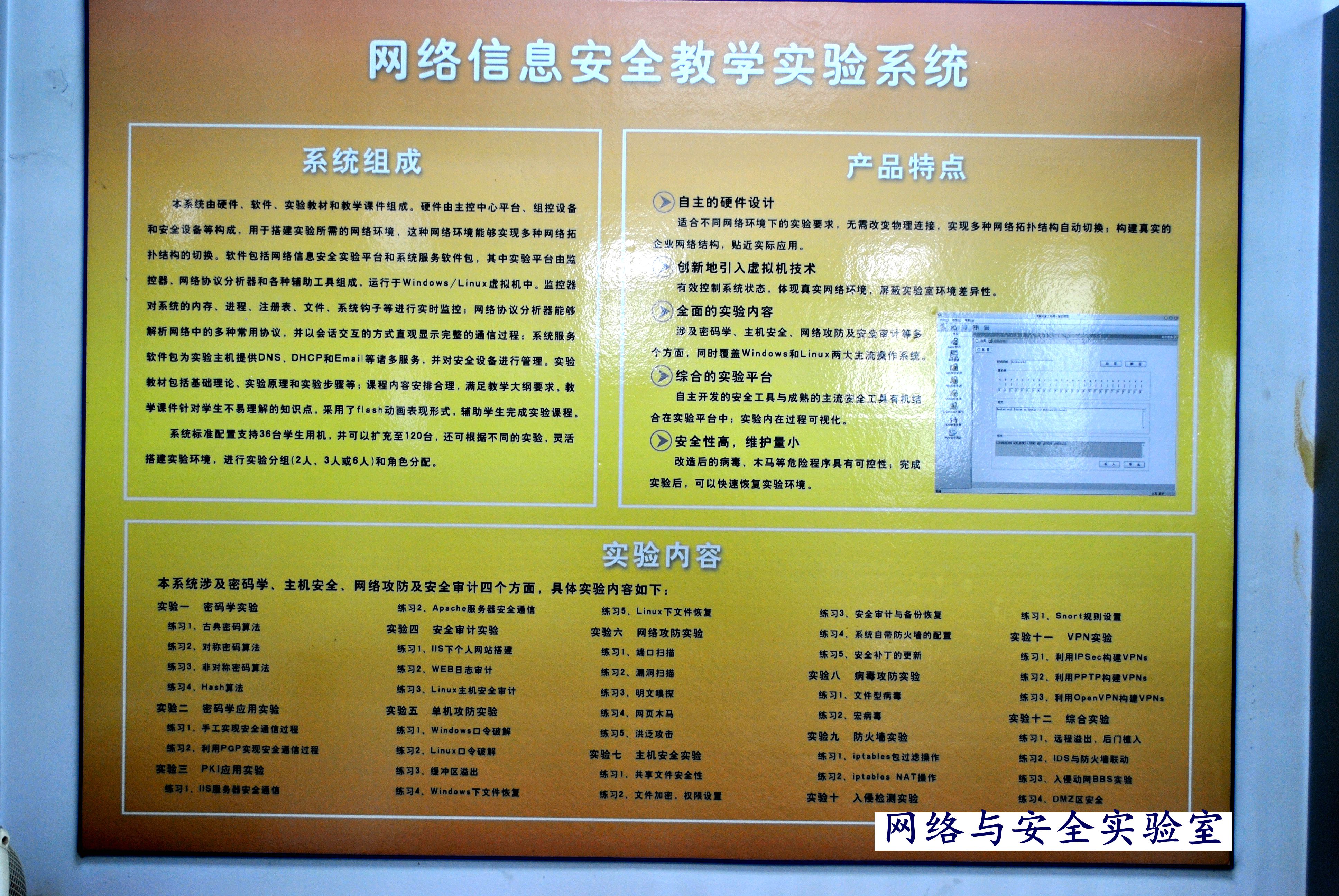 网络与安全实验室由A227 、A230、B312三个实验房间组成,总面积562平方米,可同时容纳二百二十名学生上机做实验,实验室有各项完善的规章管理制度,有专职实验人员五人,其中高工三人,工程师两人。A227、A230为网络协议分析与故障诊断实验室,是基于SJB世俱杯官方网站与吉大中软公司合作研发“网络协议仿真教学系统”平台上进行的实验课。该实验独立设置、单独计入1.5学分,共计32 学分、36个实验项目。实验项目由必修课14项和选修课22项组成,其中必修课设置为计划内的实验学时,选修课设置为计划外的实验学时,验证型、设计型和综合型实验类型各占比例分别为22%、22%和56%。B312为网络与信息安全实验室,主要是面向信息安全专业的本科生开展实验课,一部分课时面向物联网工程专业和软件工程专业的本科生。网络与信息安全实验教学平台,主要由主控中心平台、安全设备、组控设备、无线组控设备、应用服务器和管理服务器组成。根据不同层次的教学需要,可搭建成实验教学所需的网络环境,可以灵活实现多种网络拓扑结构,详见(实验平台结构框图)。